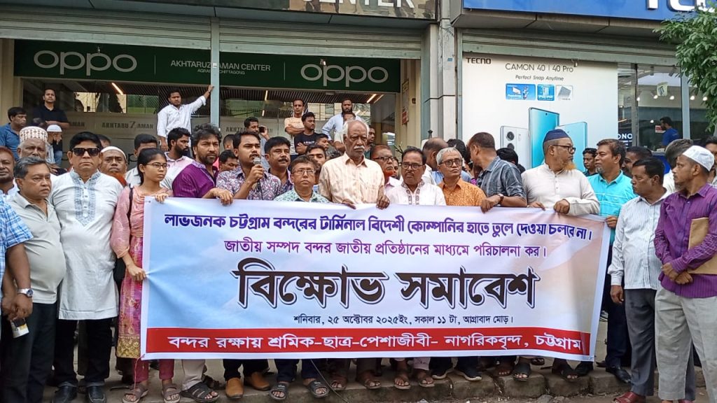 চট্টগ্রাম বন্দরকে বিদেশি কোম্পানির হাতে তুলে দেওয়ার ‘ষড়যন্ত্রের’ বিরুদ্ধে বিক্ষোভ করেছে “বন্দর রক্ষায় শ্রমিক-ছাত্র-পেশাজীবী-নাগরিকবৃন্দ, চট্টগ্রাম” নামে একটি সংগঠন। শনিবার সকালে আগ্রাবাদ মোড়ে আয়োজিত এই বিক্ষোভ সমাবেশে বক্তারা বলেন—দেশের লাভজনক ও কৌশলগত সম্পদ বন্দরকে বিদেশিদের হাতে তুলে দেওয়া জাতীয় স্বার্থের পরিপন্থী।